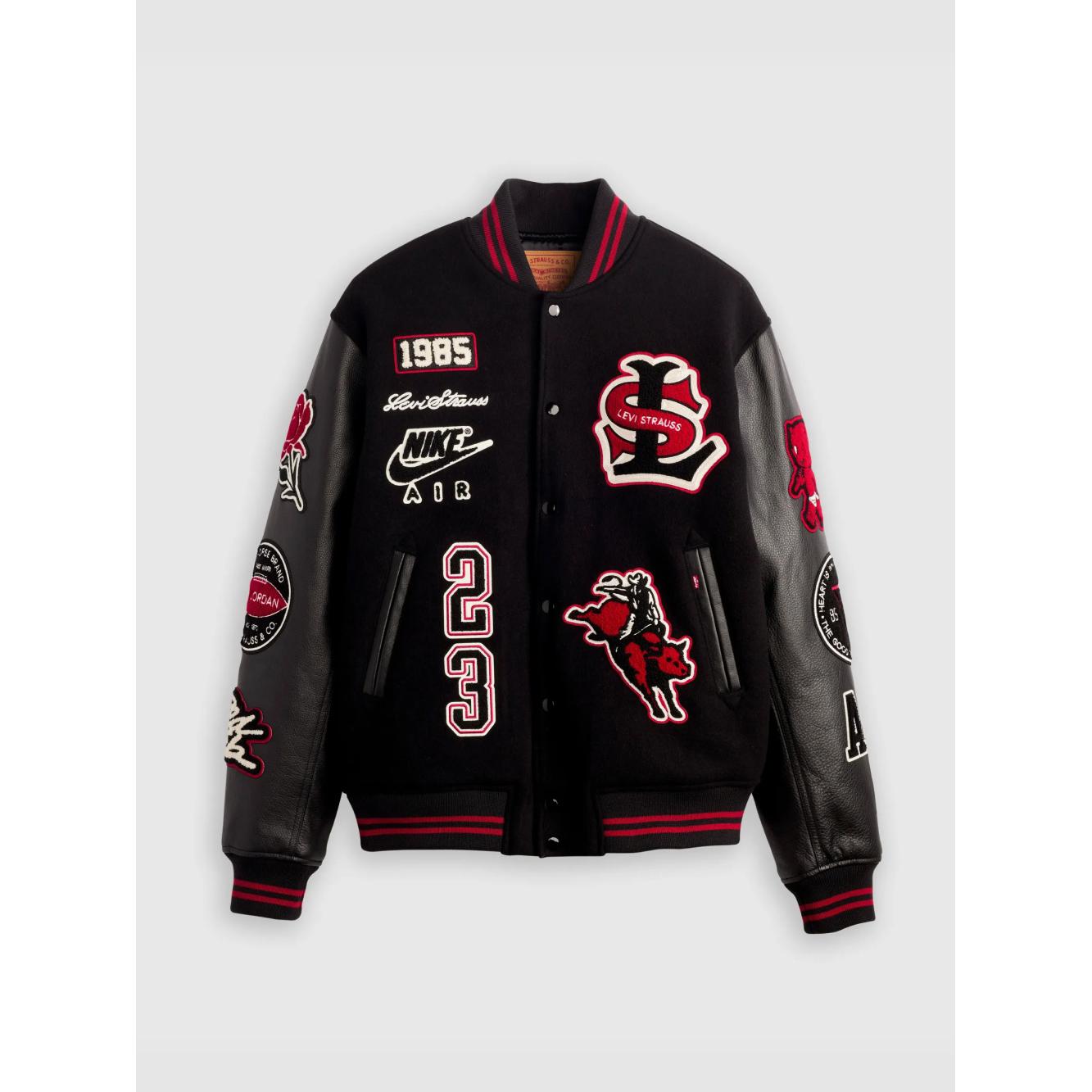 此系列的重點之作,復古拼接皮革棒球外套承接 Air Jordan 3 所象徵的文化重量,採用皮革袖身、梅爾頓羊毛衣身與鋪棉緞面內襯,構築俐落而有份量的外套輪廓,運用異材質拼接輕鬆打造層次感。外套上裝飾取材自兩大品牌典藏的復古圖像,其中「牛仔騎牛」刺繡徽章向公牛隊傳奇 Michael Jordan 致敬,成就這款兼具收藏價值與文化象徵的關鍵單品。